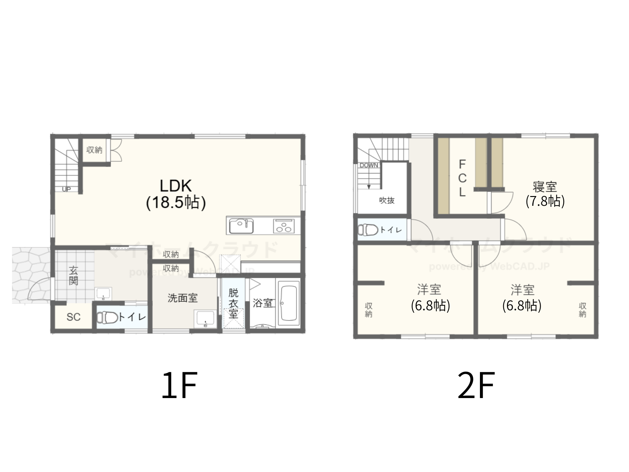 2階:洋室7.8・洋室6.8・洋室6.8・ファミリークローク・WC