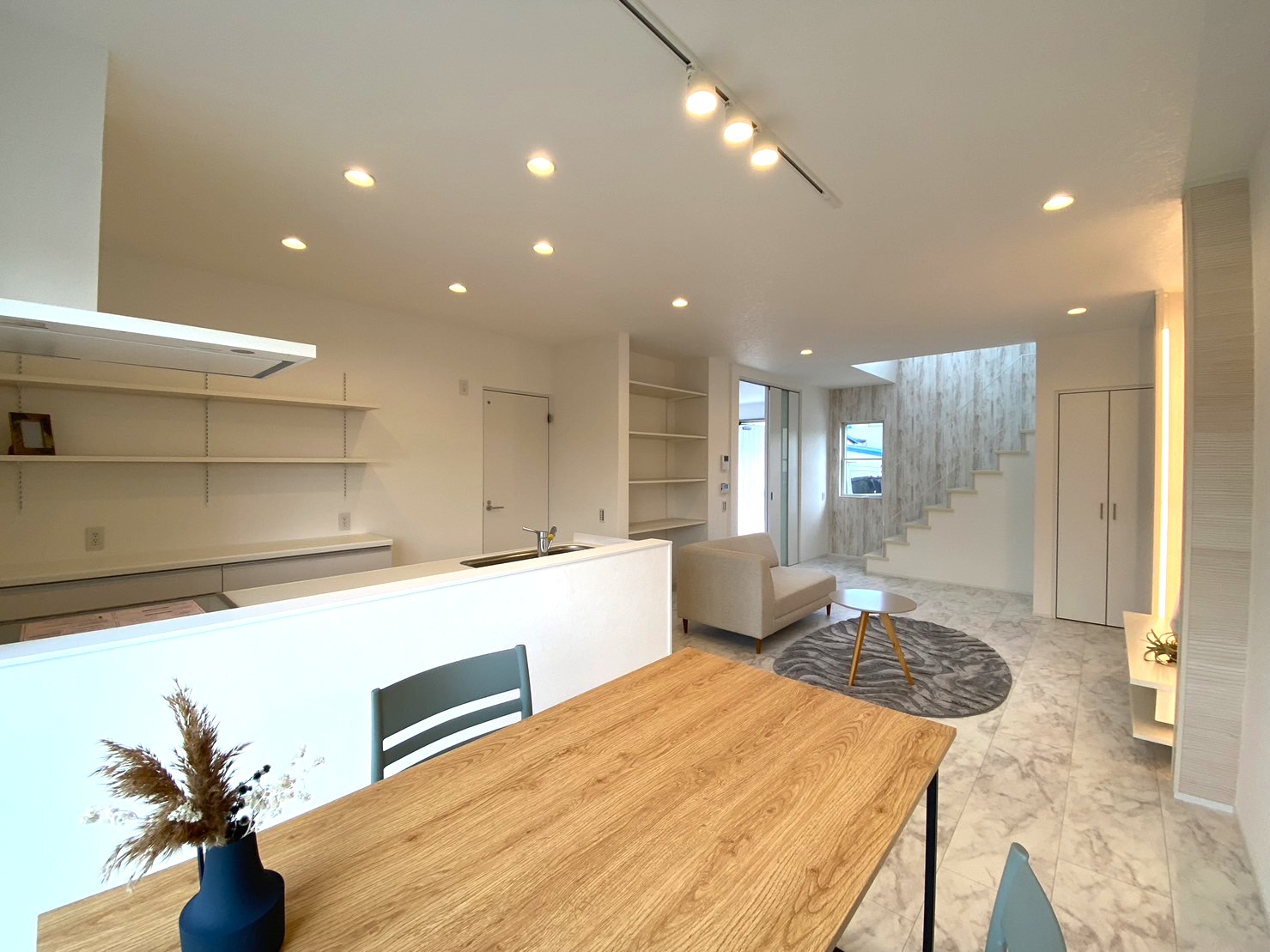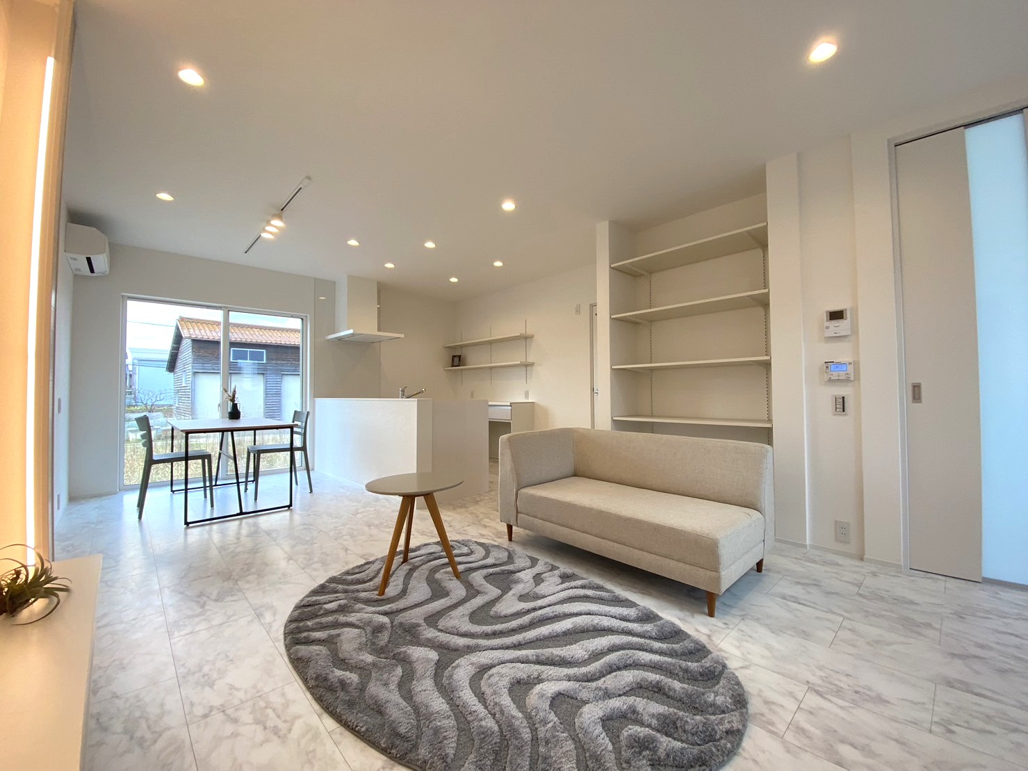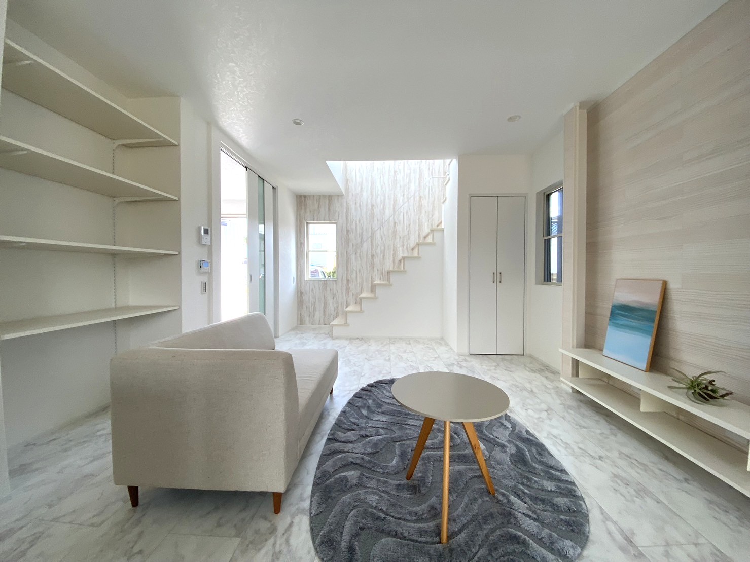 三角屋根の北欧スタイル分譲!白を基調とした2方向から光が入り明るい室内、収納も豊富です。前面道路は、車通りも少なく駐車3台楽々可能。