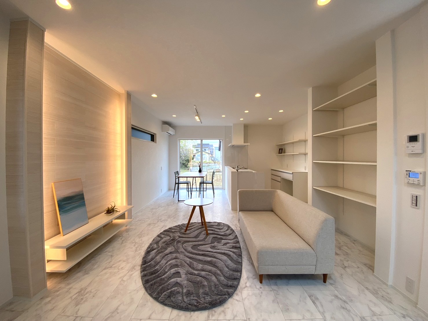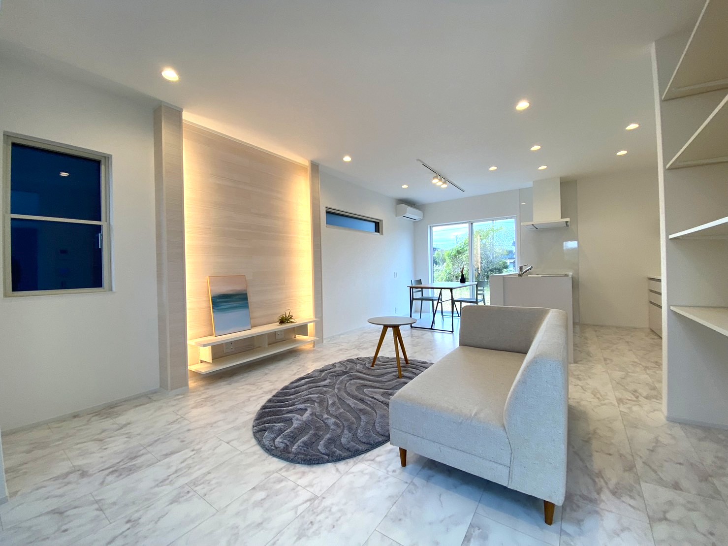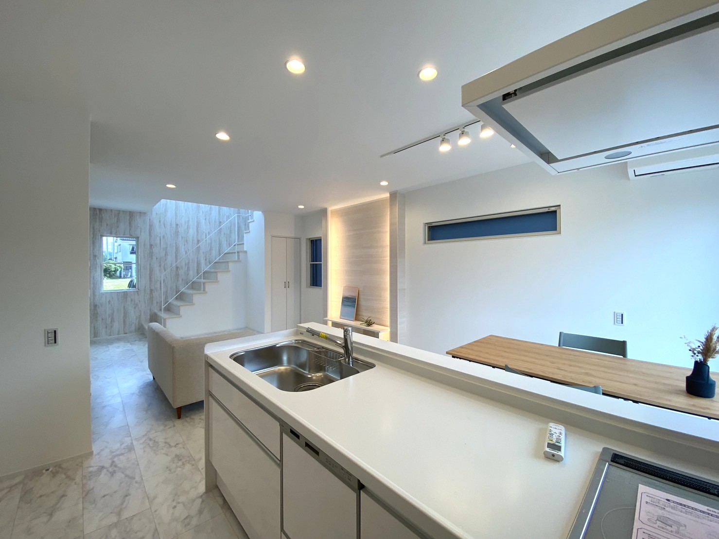 三角屋根の北欧スタイル分譲!白を基調とした2方向から光が入り明るい室内、収納も豊富です。前面道路は、車通りも少なく駐車3台楽々可能。