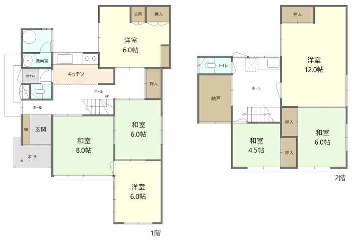 2階:洋室12.0・和室6.0・4.5・納戸・水洗