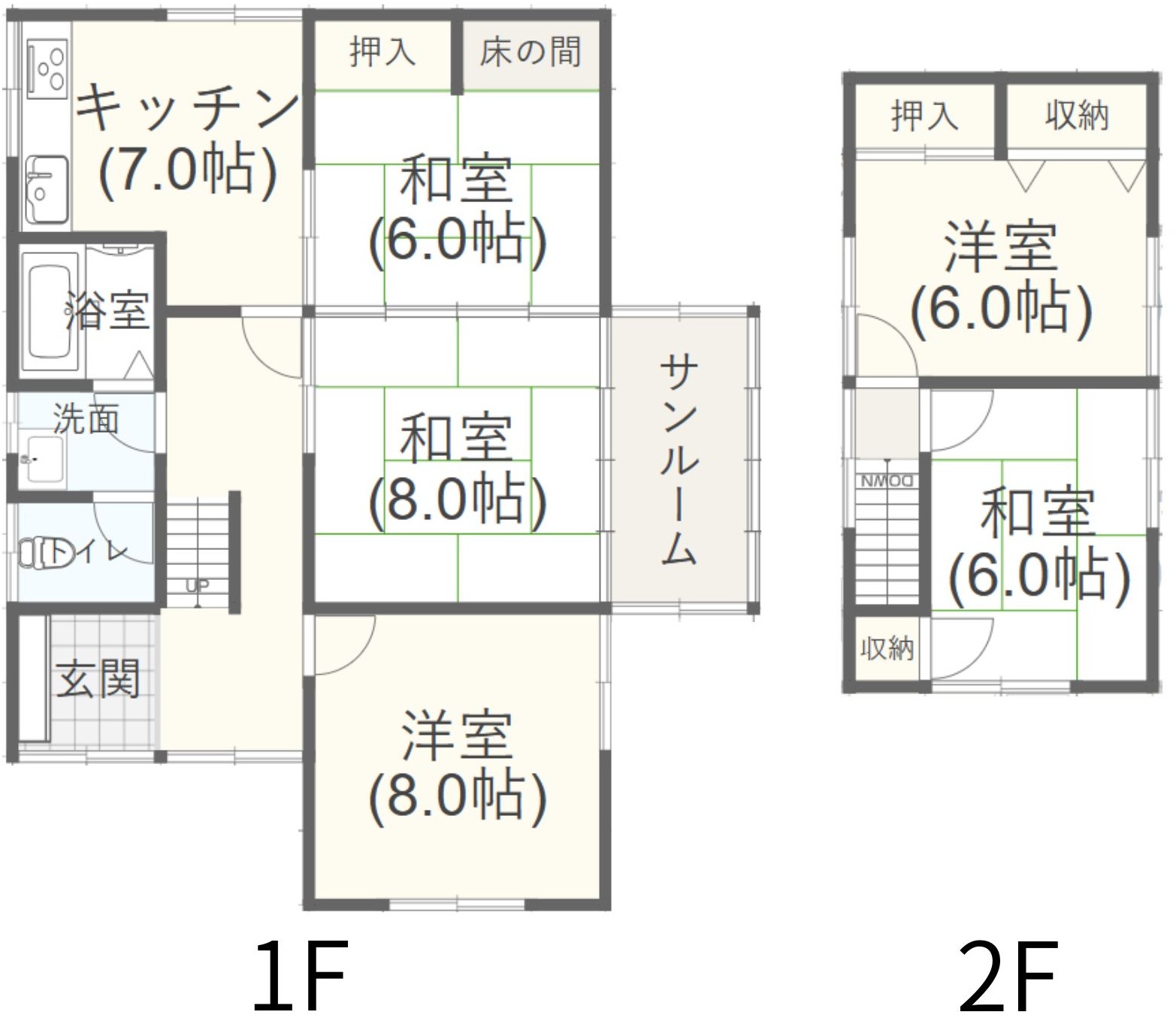 1階:洋室8.0・和室8.0・和室6.0・キッチン・浴室・洗面・水洗・SR