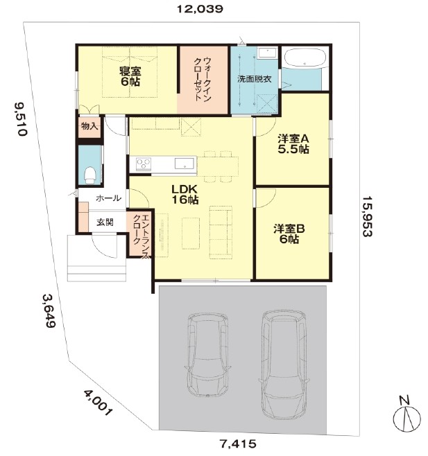 1階:LDK16.0・洋室6.0+WIC・洋室6.0・洋室5.5・洗面・浴室・WC・エントランスクローク